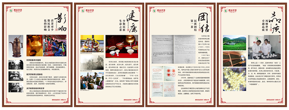 文字與圖片,包括黑茶(茯茶)歷史淵源,茯茶(邊銷茶)與西北邊疆地區的關系、對西北少數民族生活及文化的影響,湖南近代黑茶先驅彭先澤與益陽茶廠前身的關系(正本清源),益陽茶廠建廠前后的歷史,益陽茶廠建廠60年來的巨大變化及科研成就,湘益茯茶的卓越品質及市場的影響力,歷年來領導班子及組織機構,文字內容相配套的圖片。