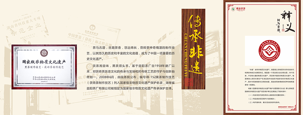 國家非物質文化遺產傳承保護單位,2008年益陽茯磚茶制作技藝被列入國家級非物質文化遺產,而益陽茶廠是這技藝的唯一傳承保護單位。
