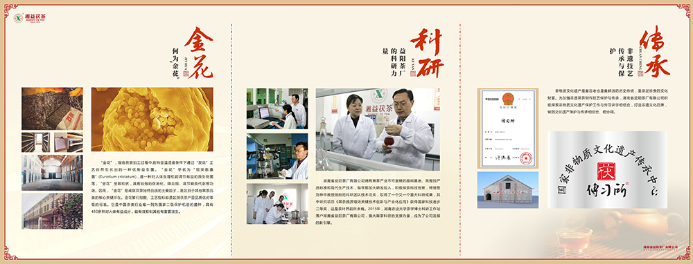 茯茶是黑茶中非常有特色的一大類。金花(冠突散囊菌)是茯茶獨有的。茯茶,始于涇陽,續于安化,盛于益陽。湘益茯茶制作技藝列入國家級非物質文化遺產保護名錄,不僅承襲了茯茶制作工藝,更將此發揚光大。這是屬于茯茶的傳奇,也是屬于湘益的傳奇。