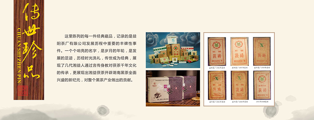 這里陳列的每一件經典藏品,記錄的是益陽茶廠有限公司發展歷程重要的豐碑性事件,一個個響亮的名字,是歲月的年輪,是發展的足跡,歷經時光洗禮,傳世成為經典,展現了幾代湘益人通過言傳身教對茯茶千年文化的傳承,更展現出湘益茯茶開辟湖南黑茶全面興盛的新紀元,對整個黑茶產業做出的貢獻。