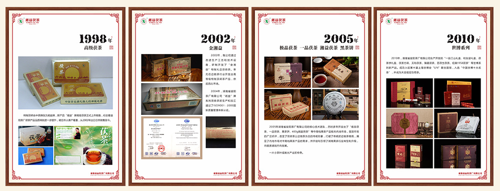 2002年,我公司通過改進生產工藝和技術設備,研制開發了”金湘益”特制禮品茯磚茶。率先在邊銷茶行業開發高等級特制茯磚茶產品,供應西北市場。2004年,湖南省益陽茶廠有限公司“湘益”牌系列茯磚茶的生產和加工通過了ISO9001:2000國際質量管理體系認證。